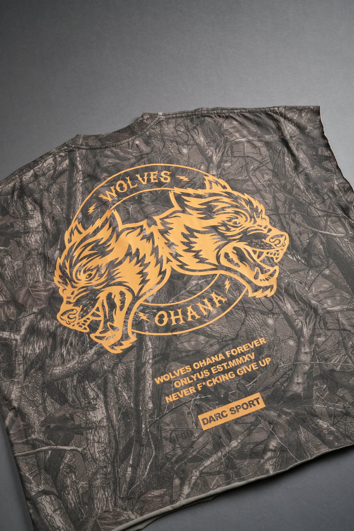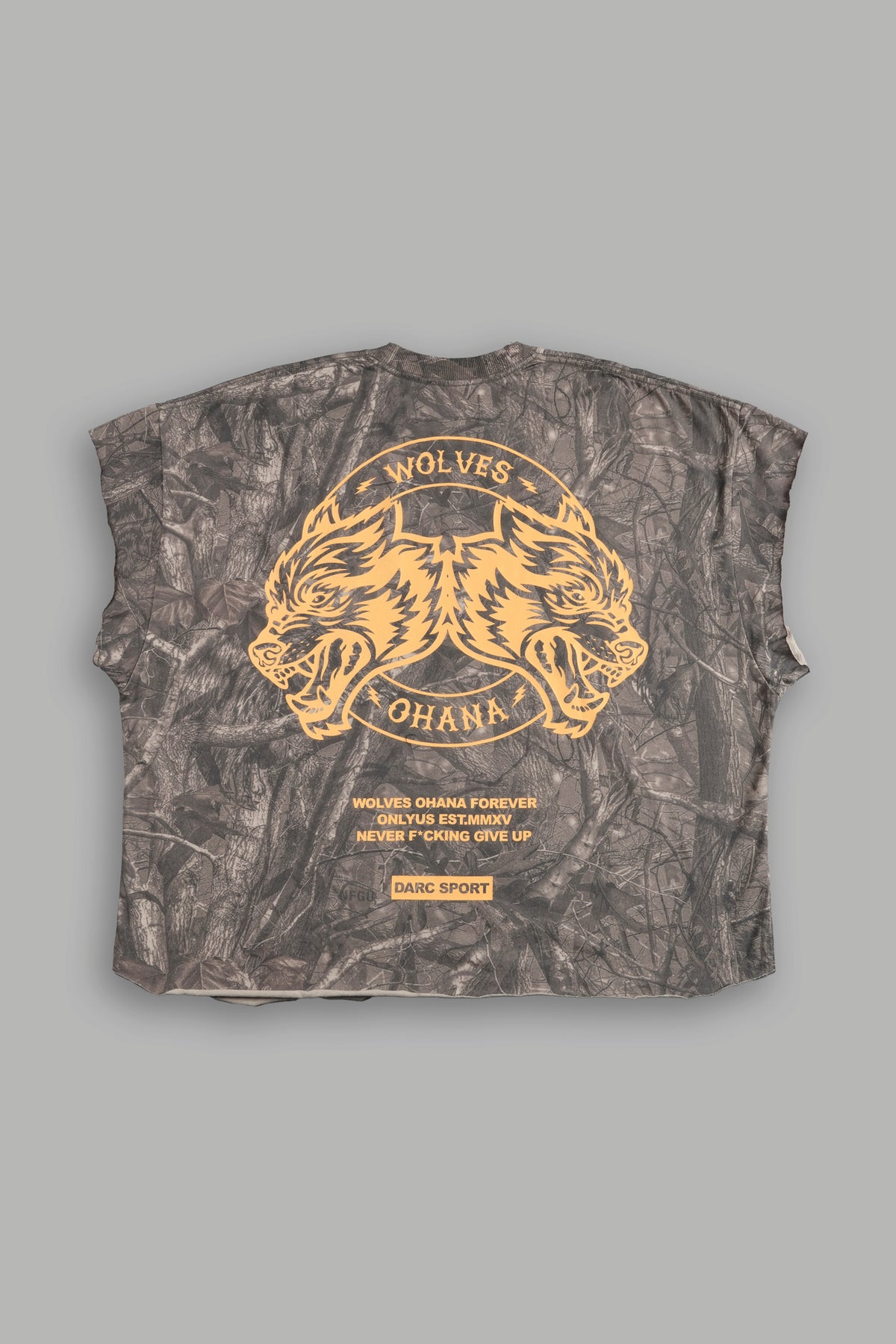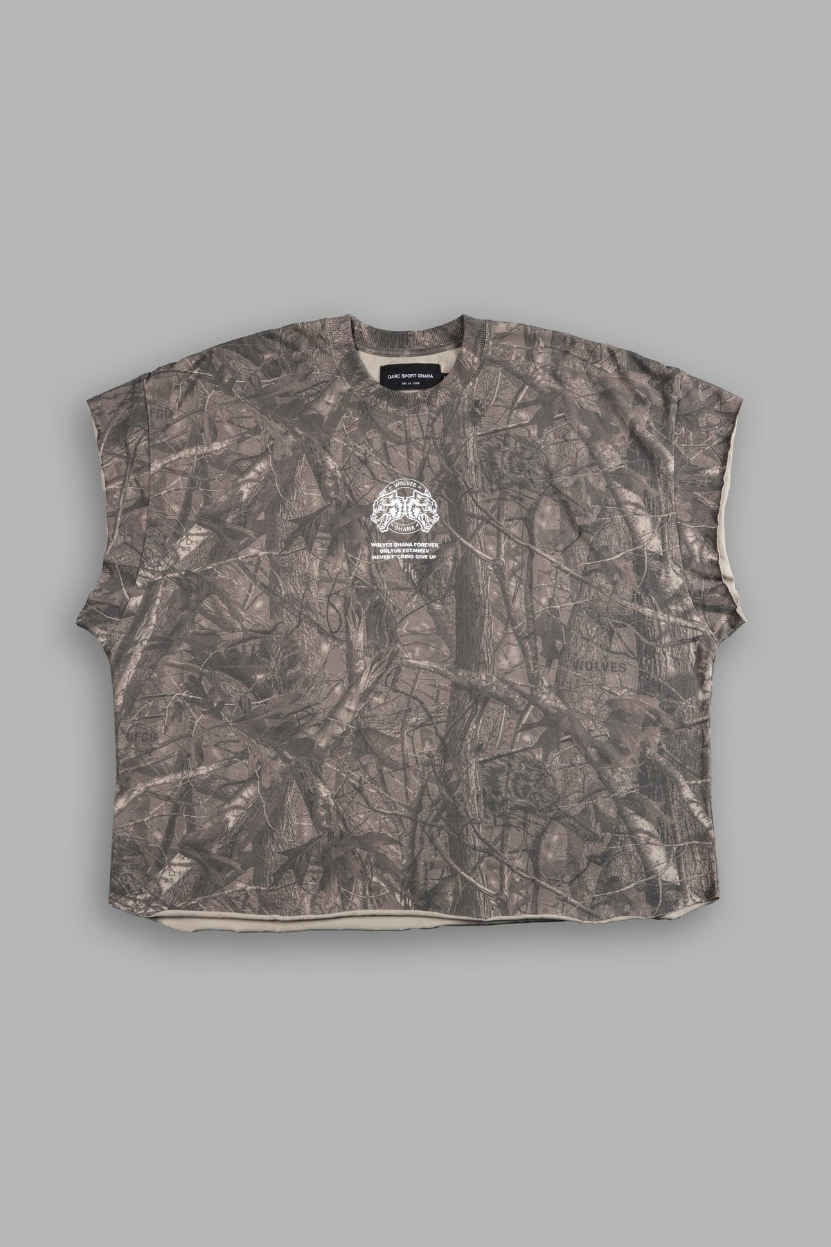 Wolves Ohana Forever "Grunge" Cut Off Tee in Dusk Moss Driftwood Forest Camo